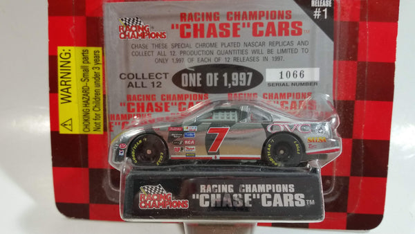 1997 Racing Champions "Chase" Cars NASCAR #7 Geoffrey Bodine QVC Ford Chrome Die Cast Toy Race Car Vehicle with Collector Card and Display Stand - New in Package Sealed