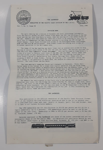 July 1982 Canadian Railroad Historical Association The Sandhouse Newsletter Of The Pacific Division Of The C.R.H.A. Vol. 7, No. 2, Issue 26