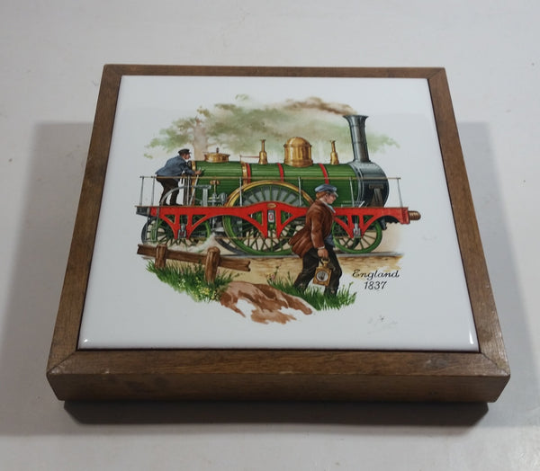 Vintage Train Locomotive England 1837 Wood Framed Ceramic Tile Trivet Railroad Collectible