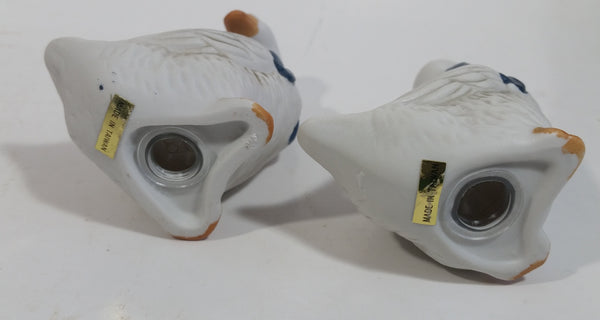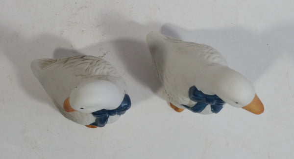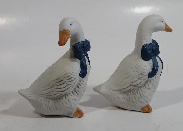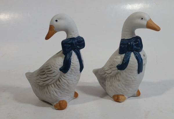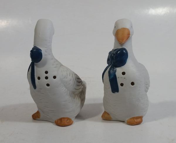 1990s Pair of White Goose Geese with Blue Bows Ceramic Salt and Pepper Shakers