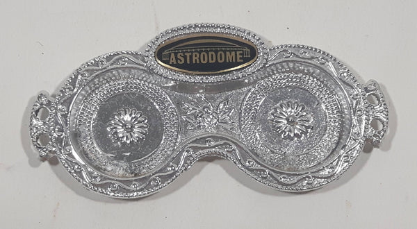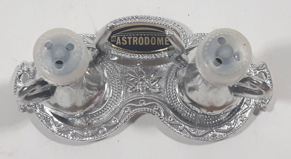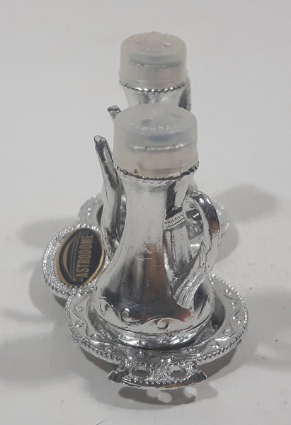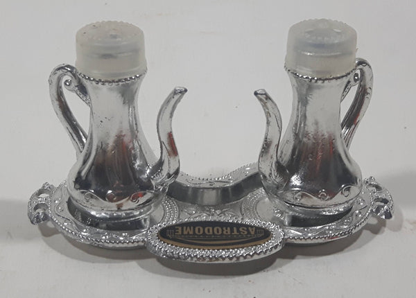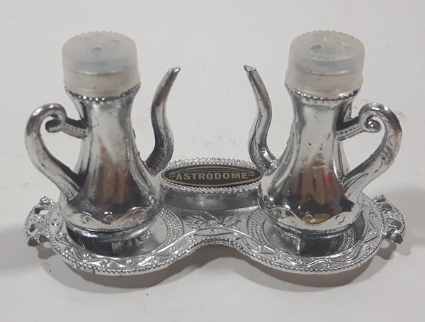 Vintage Astrodome Teapot Shaped Silver Metal 1 3/4" Tall Salt and Pepper Shaker Set with Tray