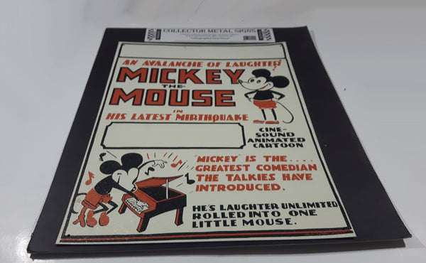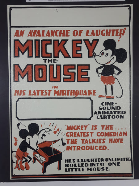 Rare An Avalanche Of Laughter Mickey The Mouse In His Latest Mirthquake 12 1/2" x 17 1/2" Lithographed Steel Metal Collector Sign On Cardboard Backing
