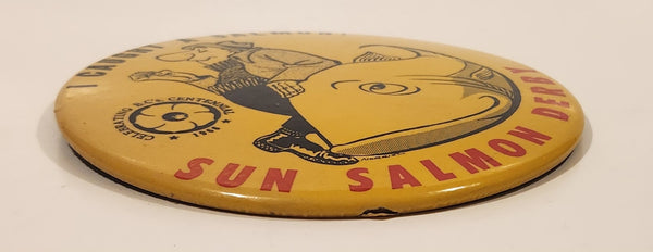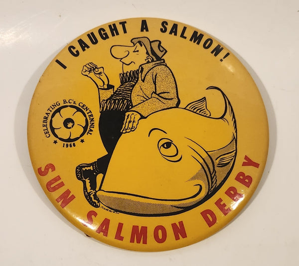 Vintage 1966 Celebratring B.C.'s Centennial Sun Salmon Derby I Caught A Salmon! 6" Button Pin