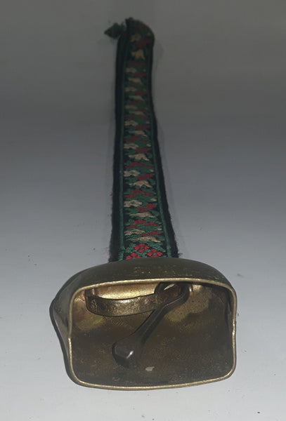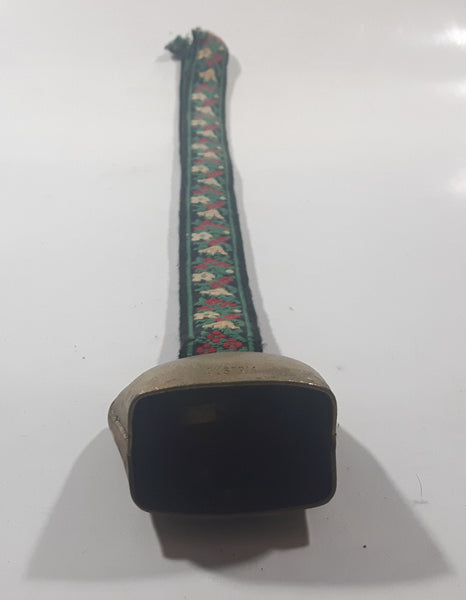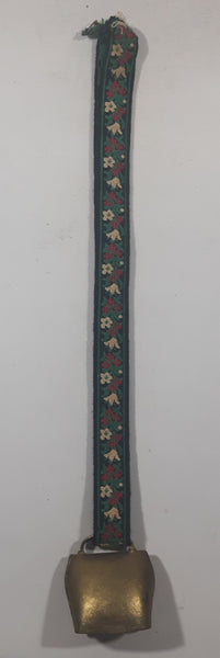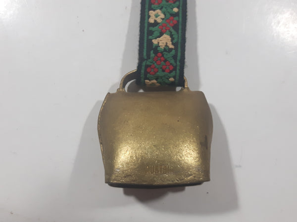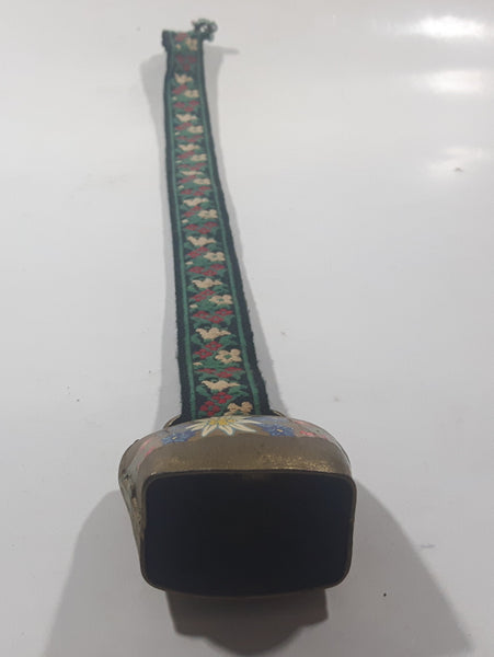 Vintage Austria Hand Painted Brass Cowbell With Flower Embroidered Ribbon