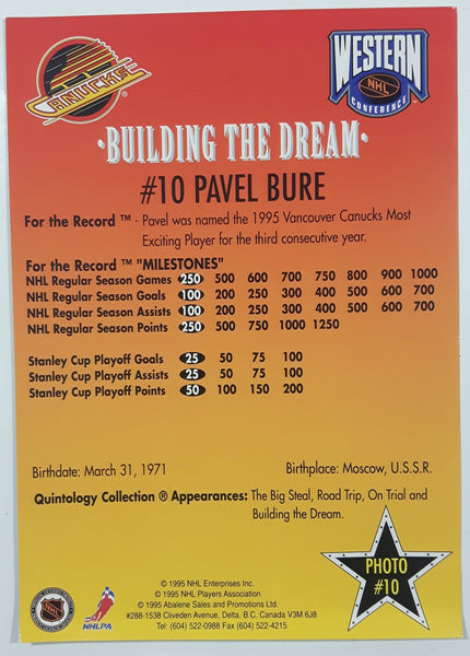 1995 NHL Enterprises Quintology Collection Building The Dream #10 NHL Pavel Bure Vancouver Canucks Jumbo 5" x 7" Photo Hockey Card