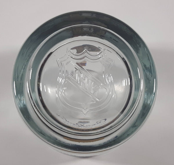 Official NHL product. Embossed NHL logo on the base, printed team logo on one side, printed NHL logo, Crown Royal logo, and slogan "Official Whisky of the NHL"