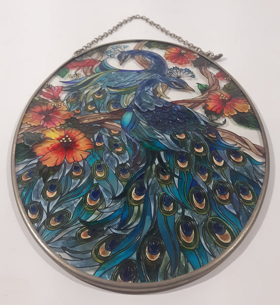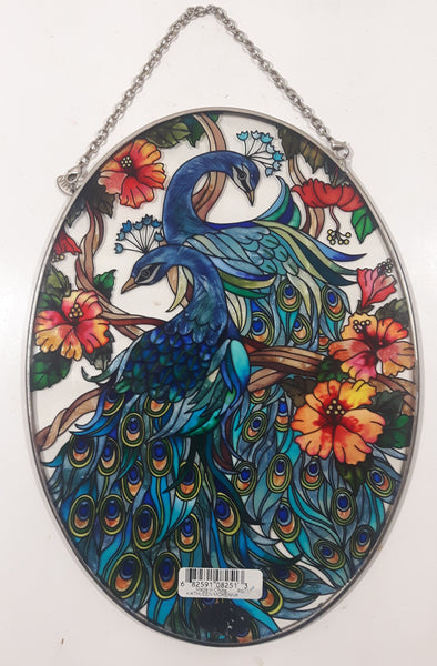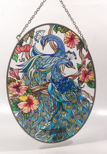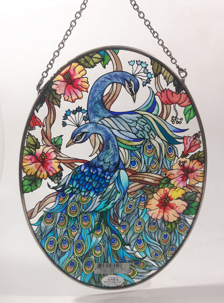 AMIA Kathleen Mckenna Detailed Blue Peacocks Oval Shaped Hand Painted Stained Glass Window Sun Catcher Hanging
