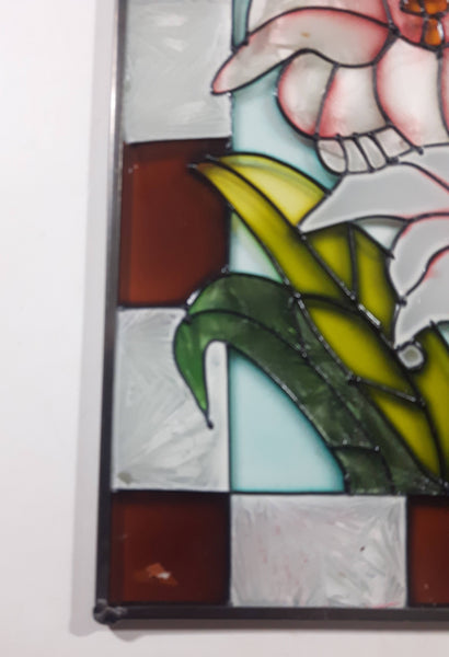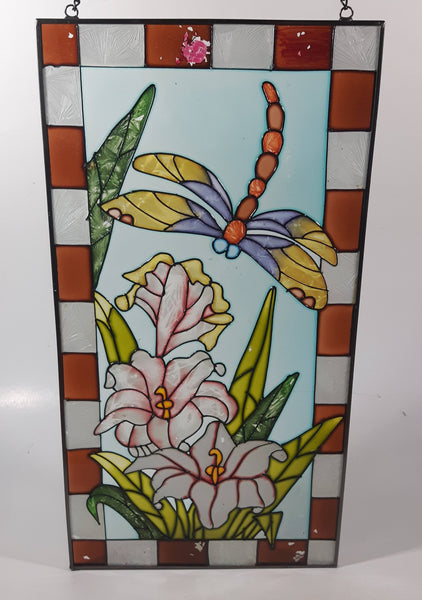 Beautifully Designed Dragonfly with Pink Flowers 8 1/4" x 16" Metal Framed Stained Painted Glass Window Pane Sun Catcher