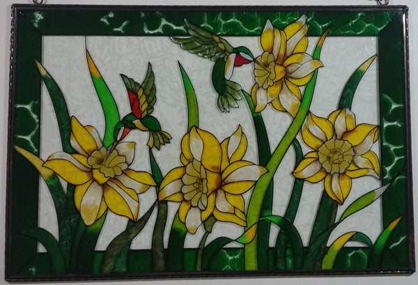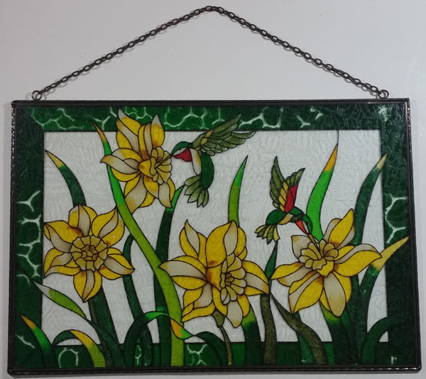 Beautifully Designed Hummingbirds Feeding on Yellow and White Flowers 12" x 18" Metal Framed Stained Painted Glass Window Pane Sun Catcher