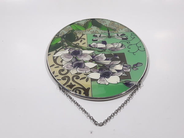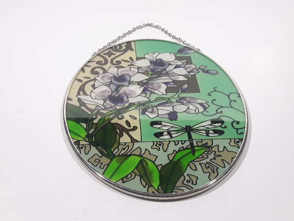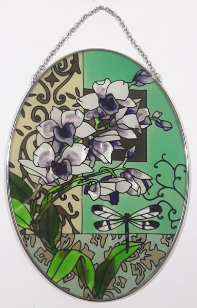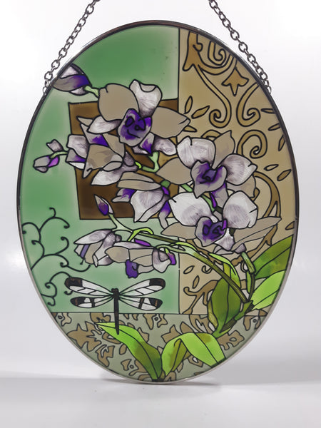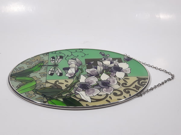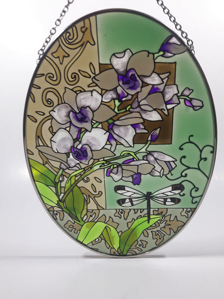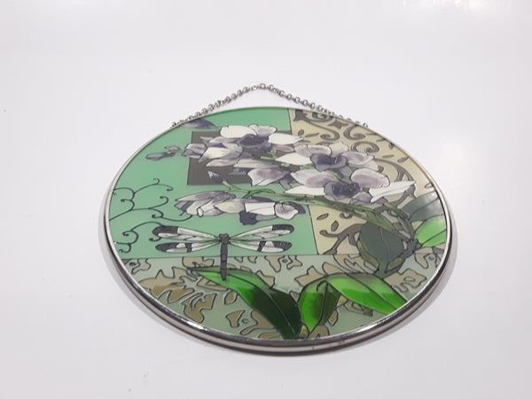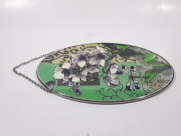 Dragonfly and Purple White Flower Themed Green Leaves Color Oval Shaped Hand Painted Stained Glass Window Sun Catcher Hanging