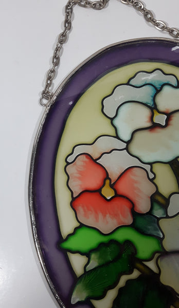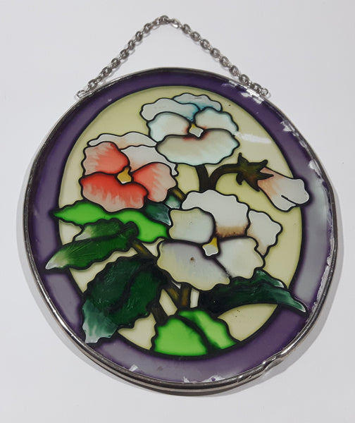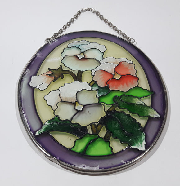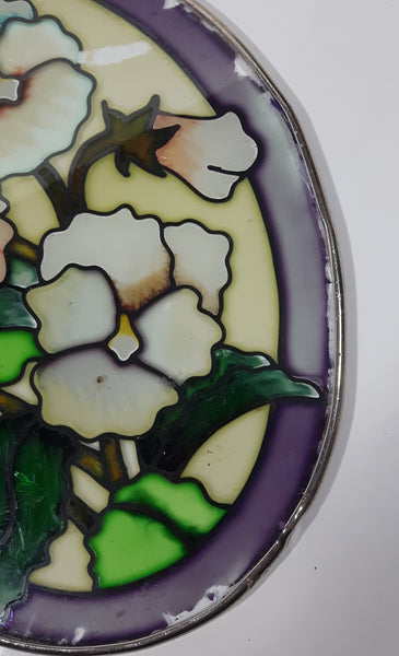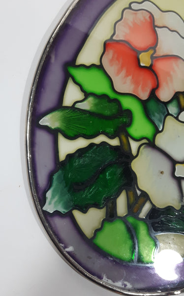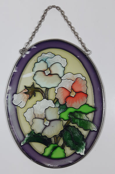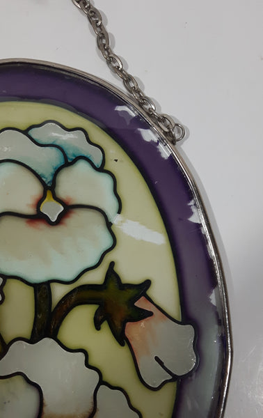 Hand Painted White Pink Flowers Themed Purple Border 6" x 8" Oval Shaped Stained Window Glass Sun Catcher