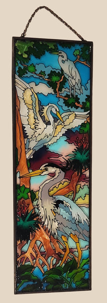 Highly Detailed Joan Baker Designs Blue Heron Birds 5" x 16" Metal Framed Hand Painted Stained Glass Window Suncatcher