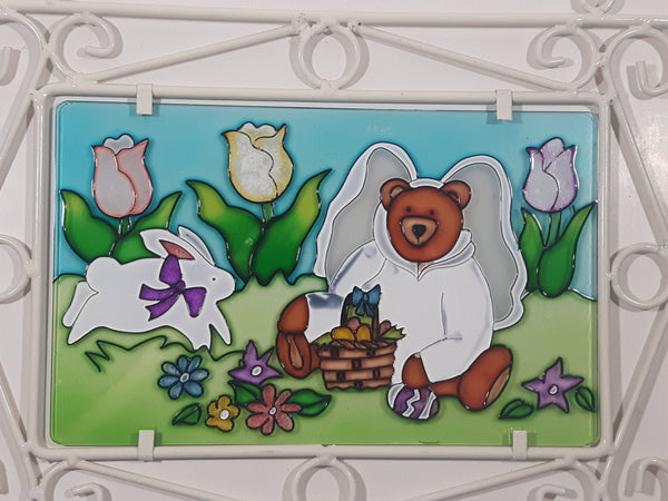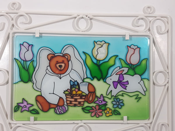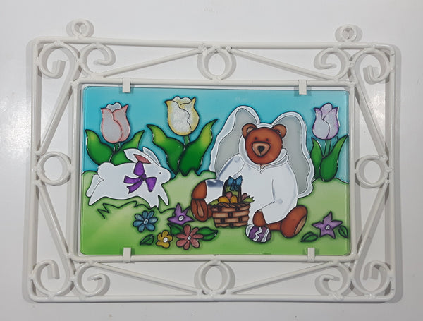 Teddy Bear Angel with Rabbit Picnic 9" x 12 5/8" Stained Glass Ornate White Painted Metal Frame