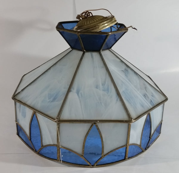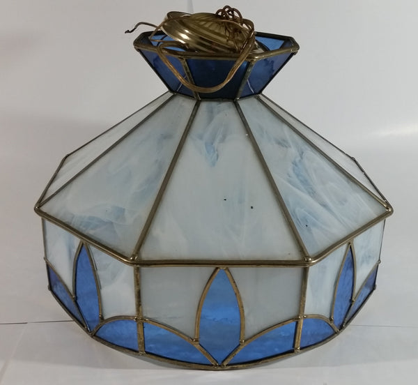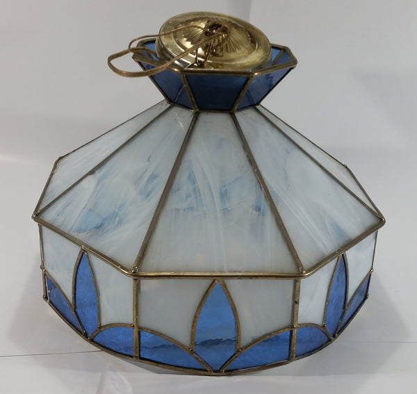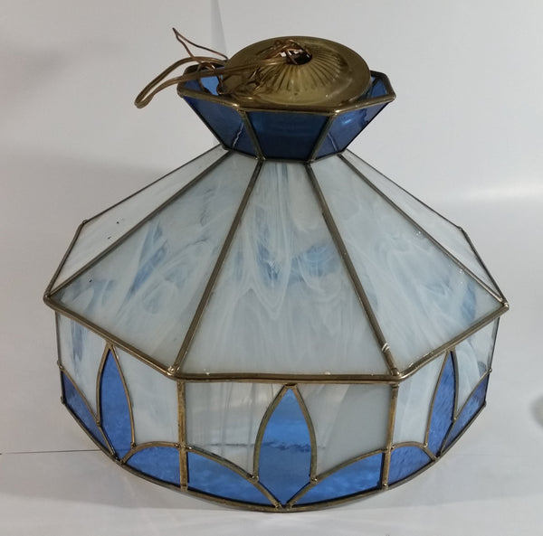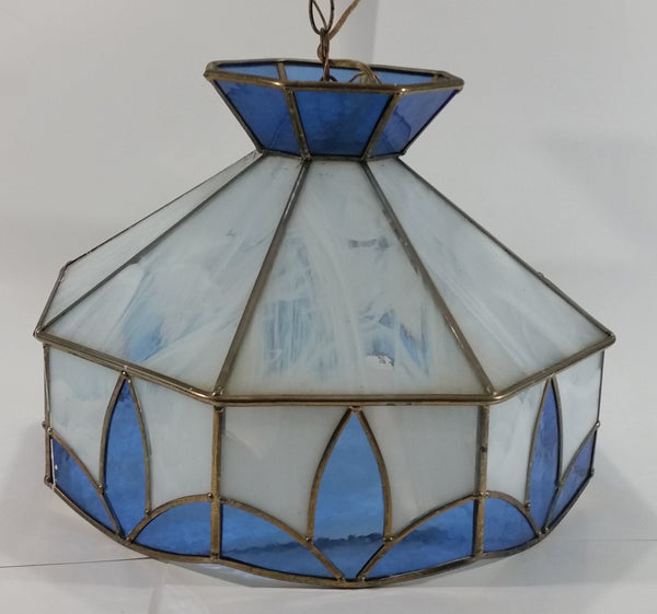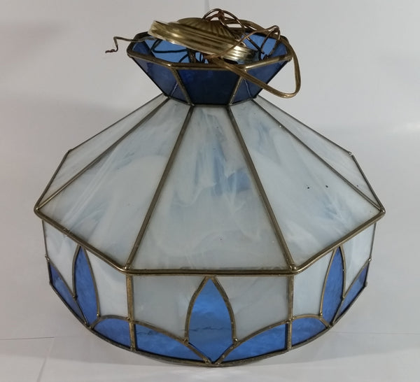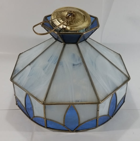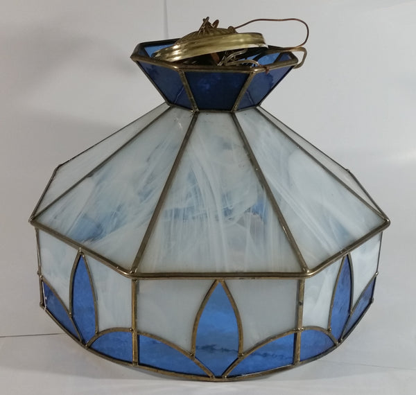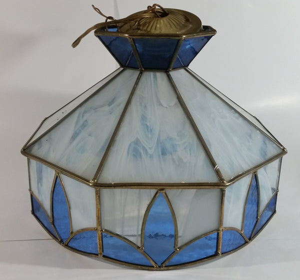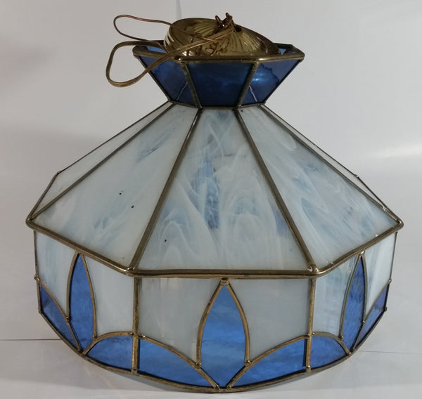 Vintage Blue and White Clear Slag Marble Stained Glass Swag Hanging Lamp Light Fixture