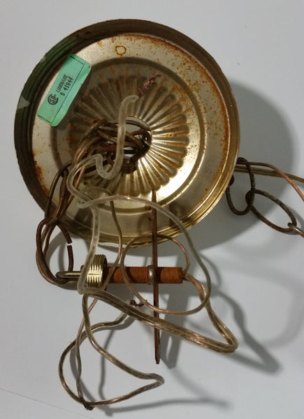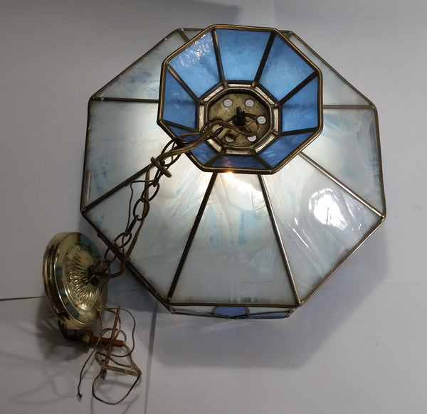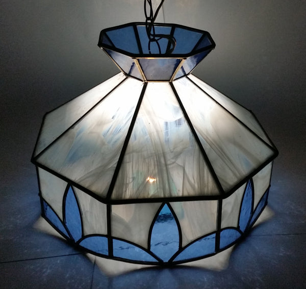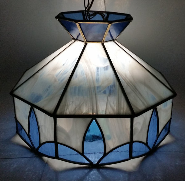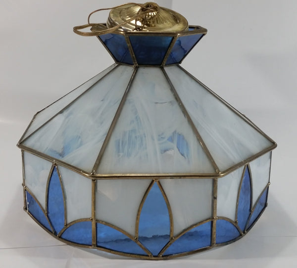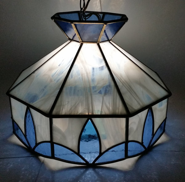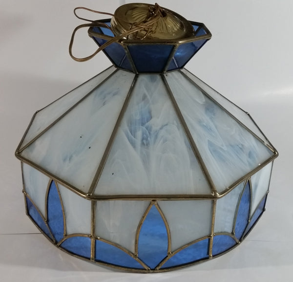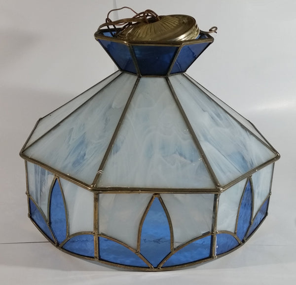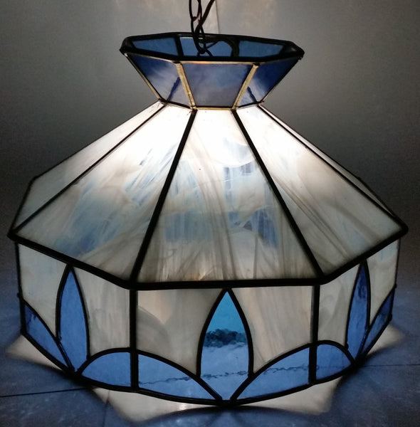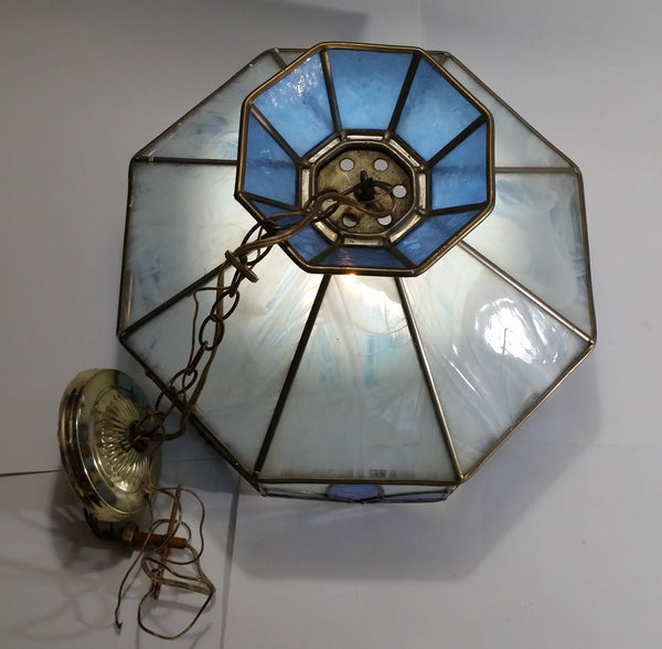 Vintage Blue and White Clear Slag Marble Stained Glass Swag Hanging Lamp Light Fixture