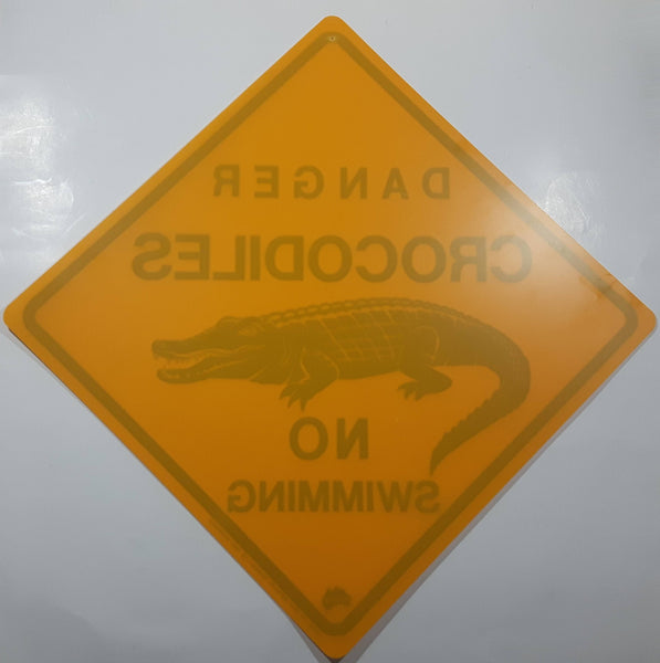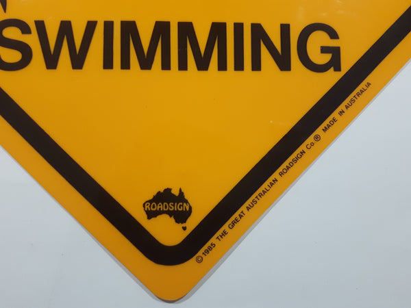 1985 The Great Australian Roadsign Co. Danger Crocodiles No Swimming Yellow Plastic Sign 14 7/8" x 14 7/8"