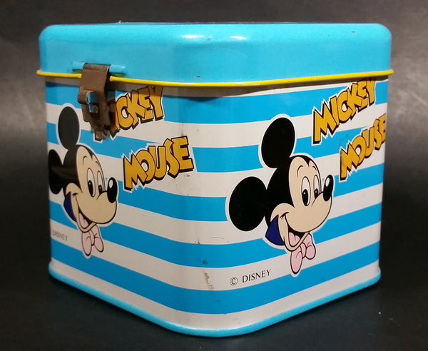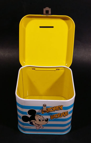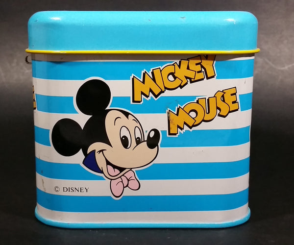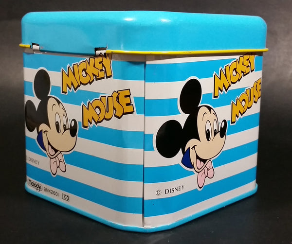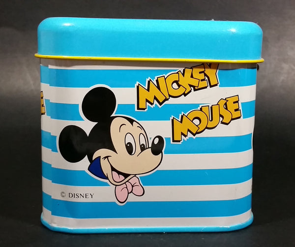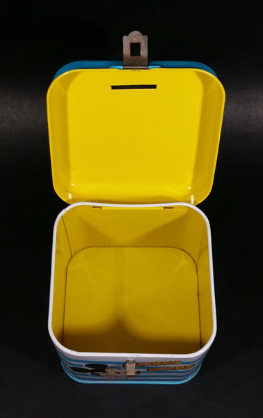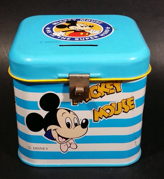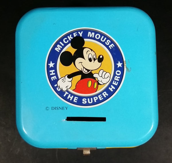 Rare Vintage 1970s Melody Disney Mickey Mouse "He Is The Super Hero" Blue and White Tin Metal Coin Bank