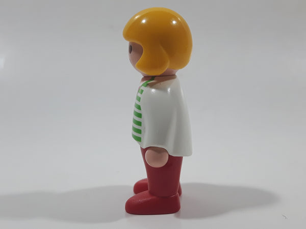 1990 Geobra Playmobil Girl with Blond Hair in White Shirt with Green Striped Sweater and Red Pants 2 1/4" Tall Toy Figure