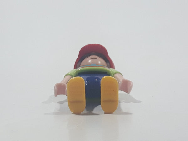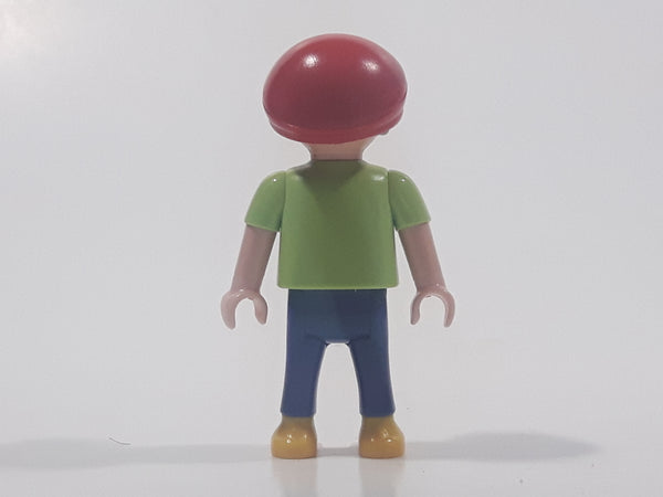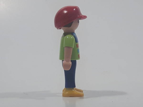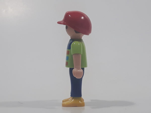 1995 Geobra Playmobil Small Brunette Boy Child Blue Pants Orange and Blue Striped Green Shirt Red Cap 2 1/8" Tall Toy Figure