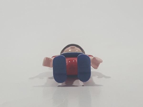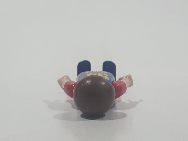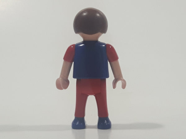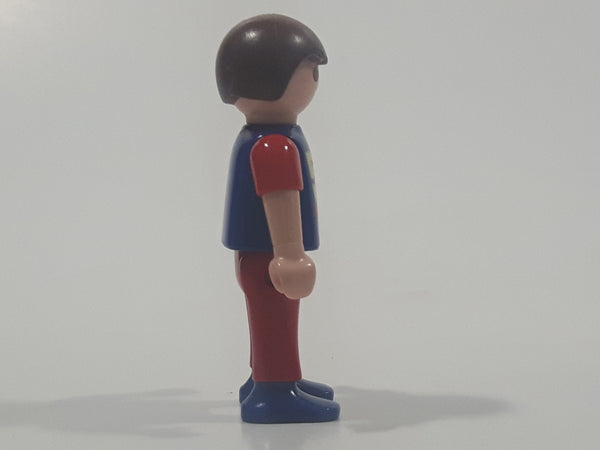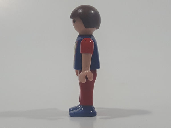 1995 Geobra Playmobil Small Brunette Boy Child Red Pants Dark Blue and Red Sleeved 54 Action Sports Shirt 2 1/8" Tall Toy Figure