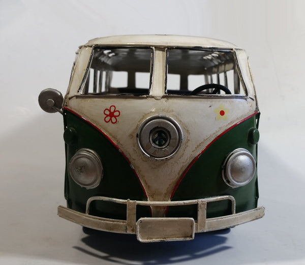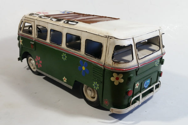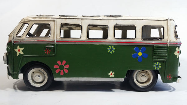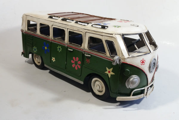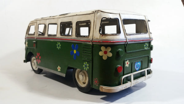 Vintage Style VW Volkswagen Hippy Bus Van Wagon Green and White Tin Metal Vehicle 13" Long