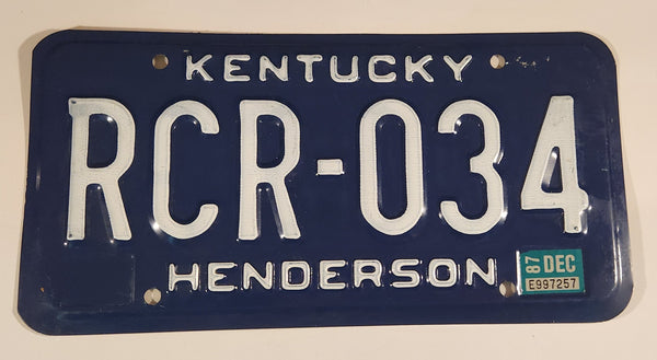 1987 Kentucky Henderson Dark Blue with White Letters Embossed Metal Vehicle License Plate Tag RCR 034