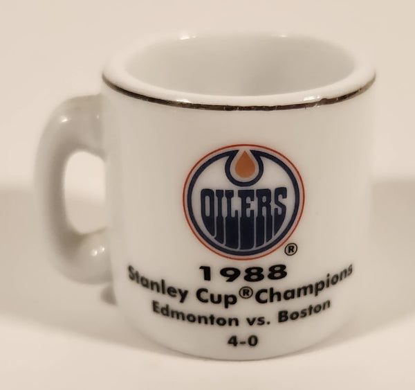 NHL Stanley Cup Crazy Mini Mug Edmonton Oilers 1988 Champs With Opponent & ScoreEdmonton Oilers vs. Boston Bruins4 -01988 Stanley Cup ChampionsExcellent condition. No chips or cracks. As seen in photos. View photos.Height: Approx. 1 1/4"Weight: 23g
