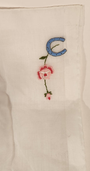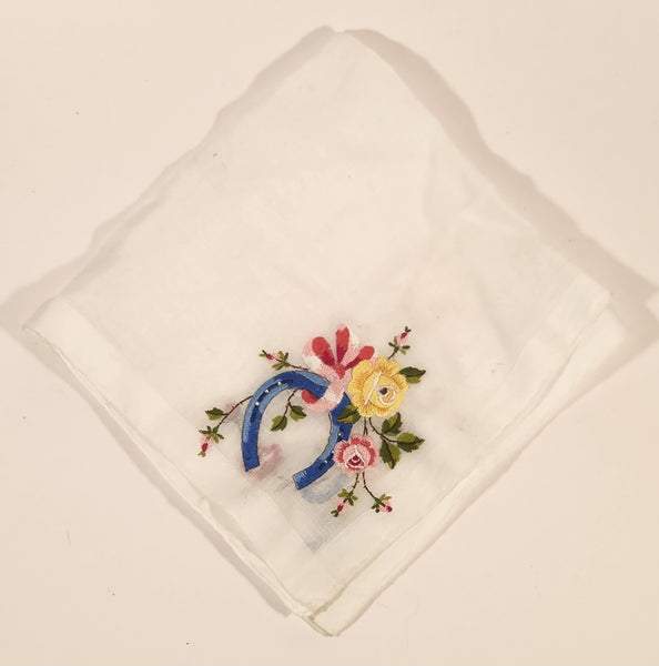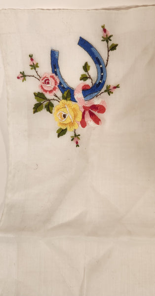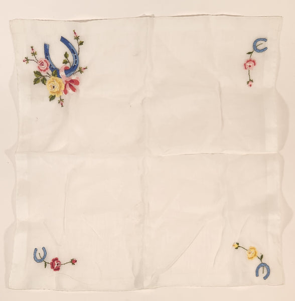 Vintage 1950s Blue Horse Shoes with Yellow and Pink Flowers White Thin Cloth Handkerchief