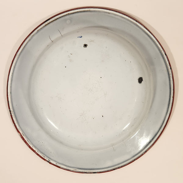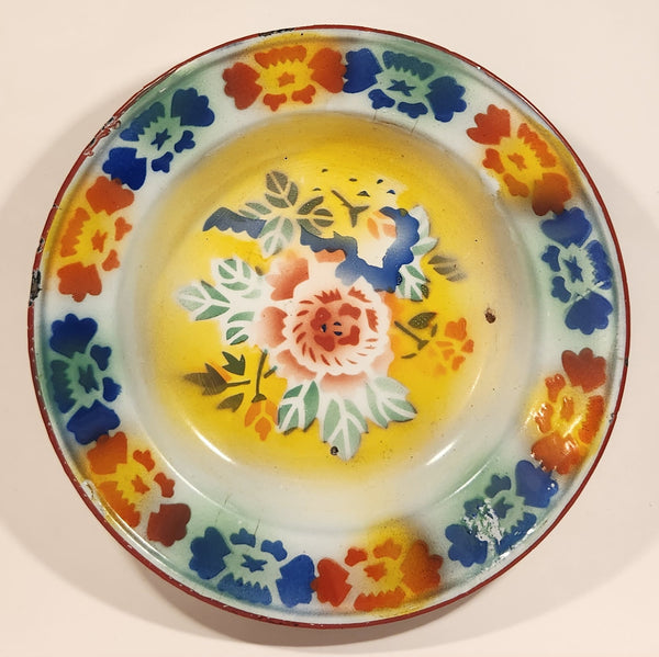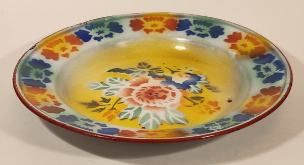 Antique Blue and Red Flower Pattern Hand Painted 9 1/2" Porcelain Enamel Metal Plate Dish