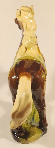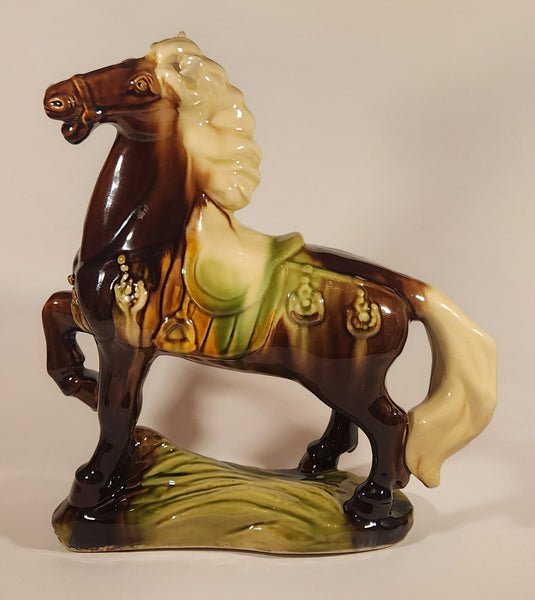 Vintage Chinese Tang Dynasty Brown War Horse with White Mane with Saddle and Medallions Glazed 12 3/4" Ceramic Figurine